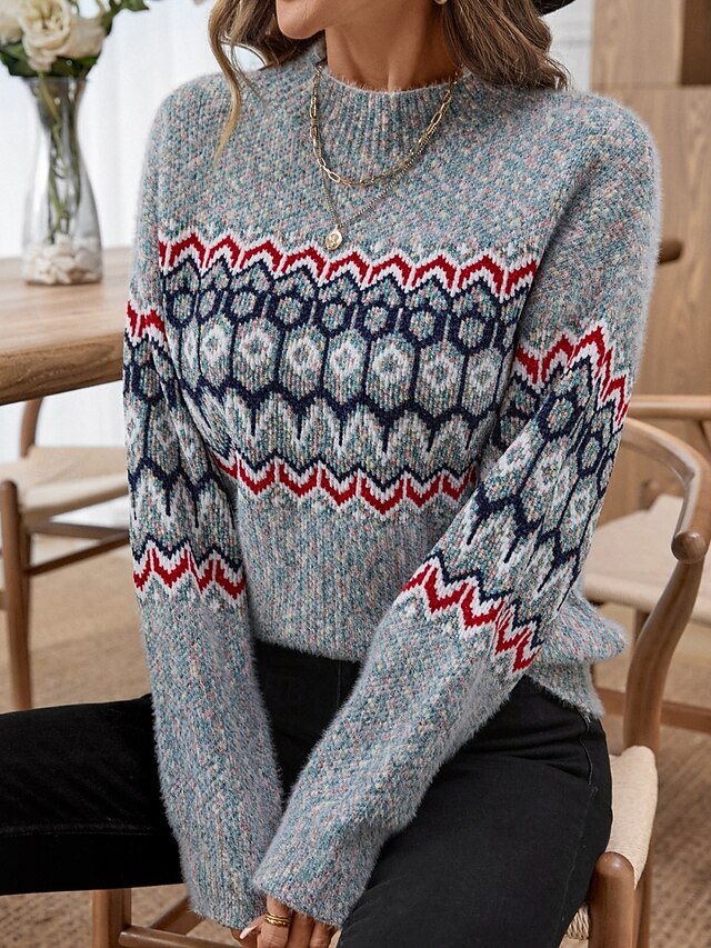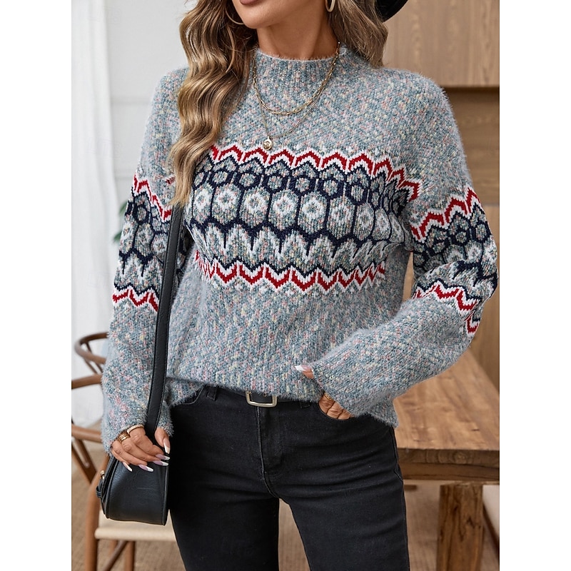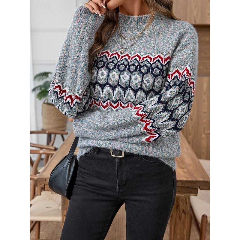 HOT ! Women's Sweater Casual Soft Geometric Ribbed Crew Neck Knitted Long Sleeve Regular Tops Knit Outdoor Daily Weekend Gray Fall Winter
