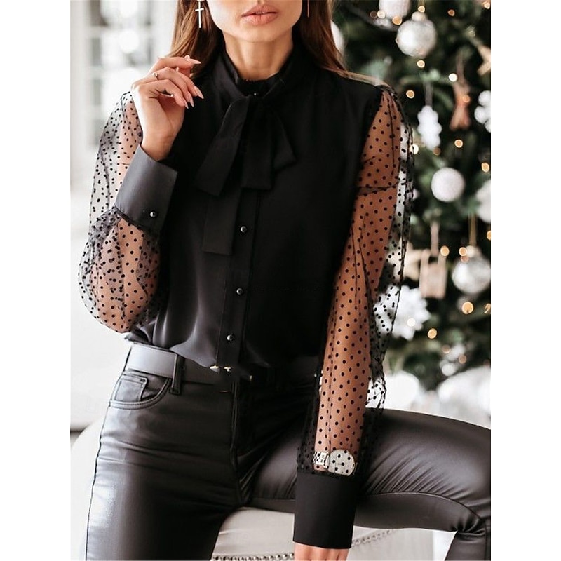 Highlights [Fabric] This women's blouse is crafted from high-quality polyester, ensuring a smooth, lightweight feel and micro-elastic fit that is perfect for the fall and winter seasons. The fabric offers both comfort and a polished appearance, making it suitable for daily wear. [Fit Type] Featuring a regular fit, this blouse is tailored to flatter a range of body types while maintaining professional and elegant lines. Its regular top length makes it versatile to pair with skirts or trousers. [Design Highlights] The blouse showcases a classic turtleneck with a sophisticated tie front, adding a refined feminine touch. Its standout feature is the sheer polka-dot mesh sleeves that provide an intriguing contrast to the solid body. Long sleeves ending in wide, crisp cuffs add extra flair and a tailored look. [Occasions] This versatile blouse suits various occasions, ranging from professional work meetings to formal evening events. Its elegant style makes it appropriate for daily wear, easily transitioning from day to night. [Sizes] Available in sizes S, M, L, XL, and 2XL, this blouse accommodates a diverse range of body shapes, ensuring a comfortable and flattering fit for everyone.
