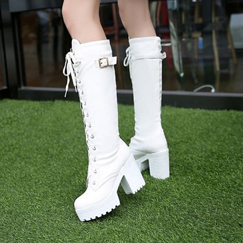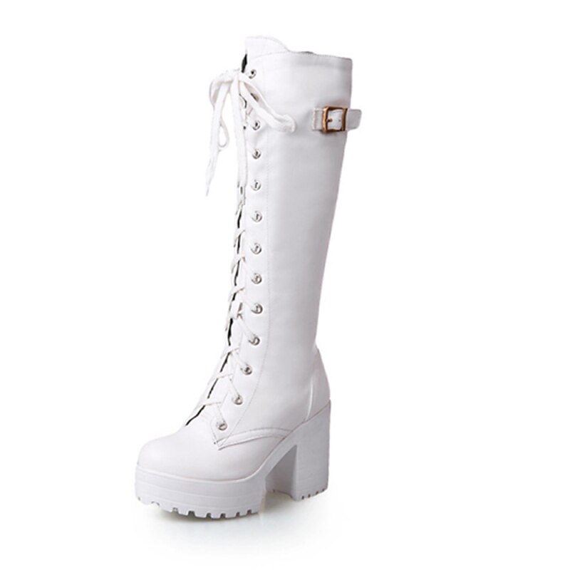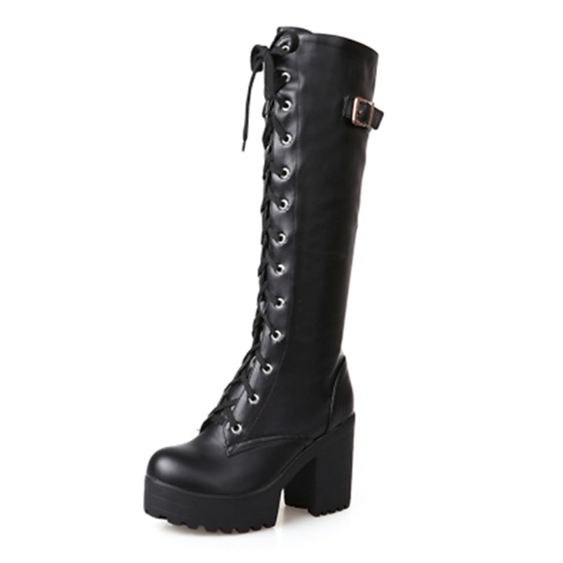 HOT ! Women's Black Platform Lace-Up Knee-High Boots with Chunky Heels and Buckle Detail – Gothic or Punk Style for Fall and Winter
