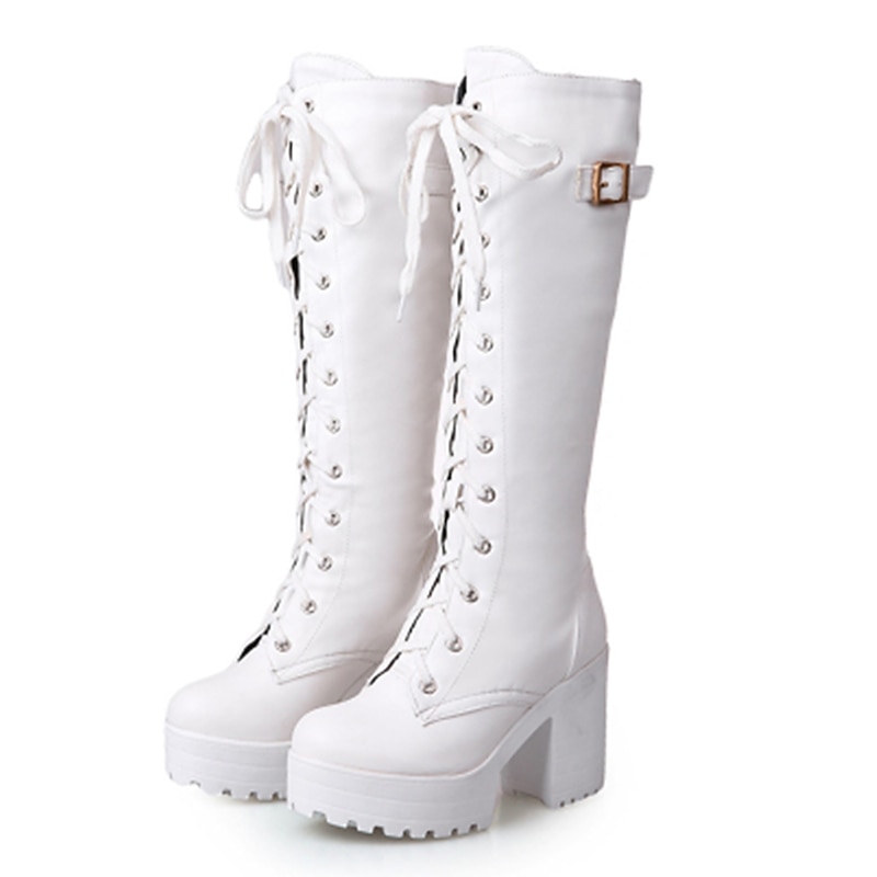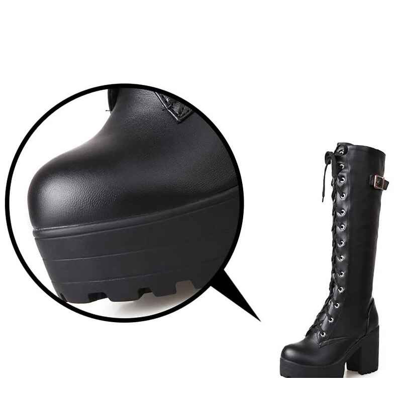 Women's Black Platform Lace-Up Knee-High Boots with Chunky Heels and Buckle Detail – Gothic or Punk Style for Fall and Winter 18