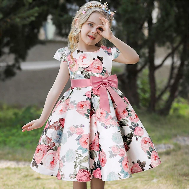 Kids Girls' Dress Party Dress Flower Short Sleeve Performance Christening dress Tie Knot Princess Polyester Midi Party Dress Summer Spring 3-10 Years claret Multicolor Color blue 24