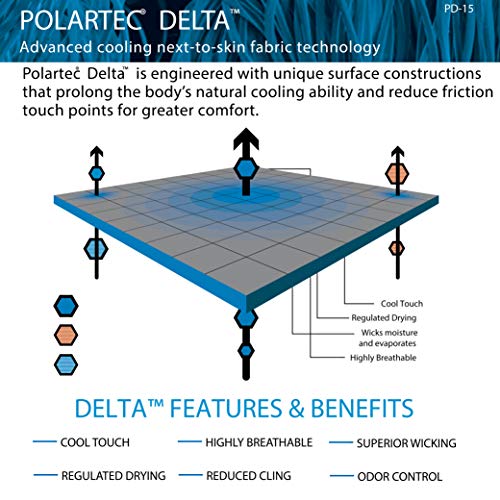• POLARTEC | Next-to-skin fabrics that target wicking and fast drying will keep moisture moving, but don't work towards actually cooling the body down. Delta works more efficiently by elevating touch-points for increased airflow, faster moisture dispersal, and reduced wet-cling.