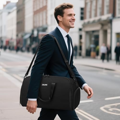 2-DAY TRAVEL GARMENT BAG: This professionally designed duffel garment bag is faultless for long weekends, family trips, weddings, business travel, vacations, and even trips to the gymWRINKLE-FREE AND EASY TO PACK: The garment compartment can hold two 50R jackets or suits, formal shirts or dresses, helping to keep your clothes wrinkle-free and ready to wearSPACIOUS WITH A SEPARATE SHOE POCKET: Carry on duffel bag can accommodate over three days' worth of clothing and features a dedicated shoe pocket to keep things separate (fits a size 13 pair of shoes)CONVENIENT TO TRANSPORT: This weekender bag is carry-on compliant for most airlines. The back trolley sleeve secures it to your luggage, the exterior zip pocket is easily accessible for essentials, and it folds flat for easy storagePREMIUM QUALITY: Made from water-resistant fabric, the garment bags for travel comes with padded, high-strength woven polyester handles and shoulder strap Perfect for everyday use. excellent materials and excellent craftsmanship ensure long-lasting durability.