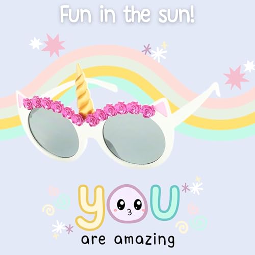 Origin: Made in the USA and ImportedFun Look: Round retro sunglasses are fun and cool to have but they can be boring and basic too. These sunnies showcases an aggresively cute unicorn horn in front with matching cat-like ears and three dimensional flower accents.Full Protection: Made from highly durable shatterproof lenses, you can be assured there will be no bending or breaking with regular use. Sporting top of the line Polycarbonate plastic glitter frames that are comfortable and supportive.UVA and UVB Protection: Feel safer and comfortable outside knowing that your child's eyes are protected from the sun's harmful rays. The lenses are flat, a cool modern feature of today's sunglasses trend. Equip your kid during lunch, costume and birthday parties, family outing, at the beach or pool, influencer images, content creation and more. Rest assured you have 100% UV 400 protection.Comfort: Great looking shades must also be comfortable and compact,with these sunnies you will get just that. Take your shades everywhere you go, they are lightweight and full of style. With our premium metal hinges, these shades will likely stay on and give your child that comfort fit even during play time. Perfect for everyday use. High quality materials and excellent craftsmanship ensure long-lasting durability.