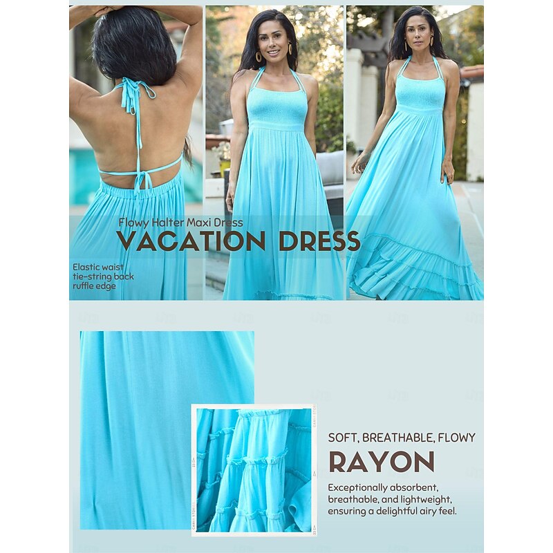 Women's Resort Maxi Dress Smocked Waist Blue Elegant Halter Neck Cami Maxi Dress Beach Cover Up 13