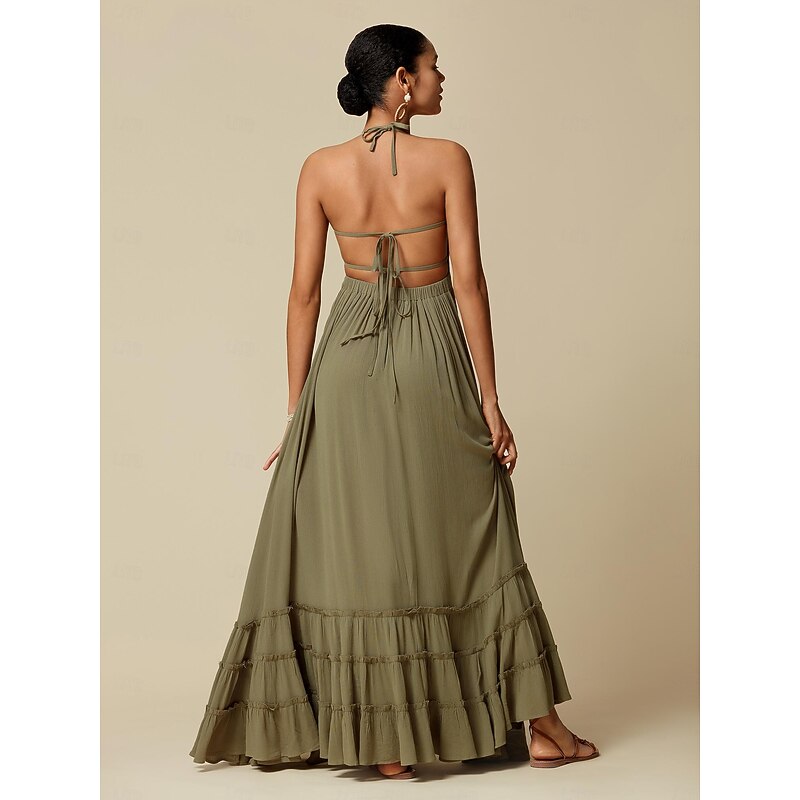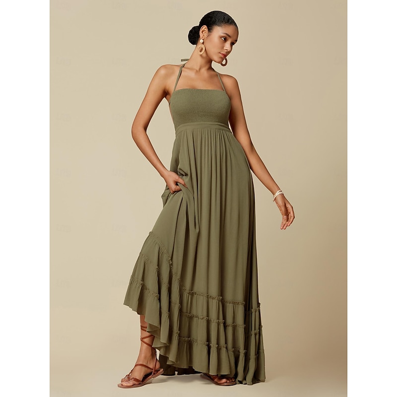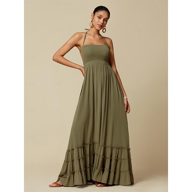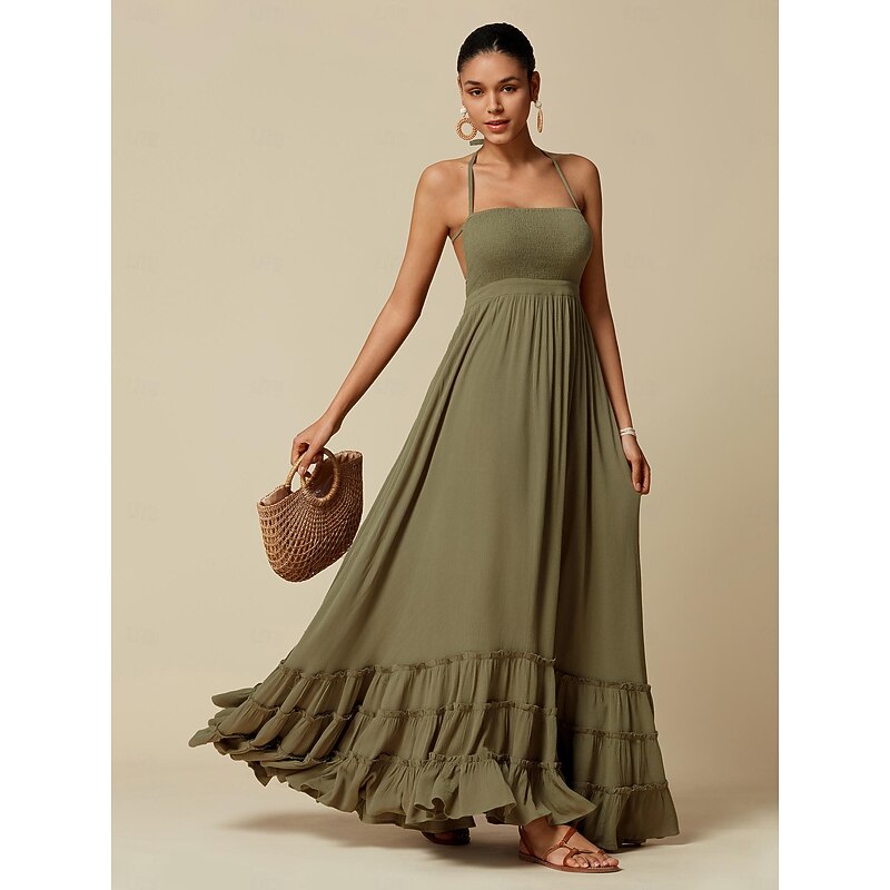 HOT ! Women's Resort Maxi Dress Smocked Waist Blue Elegant Halter Neck Cami Maxi Dress Beach Cover Up