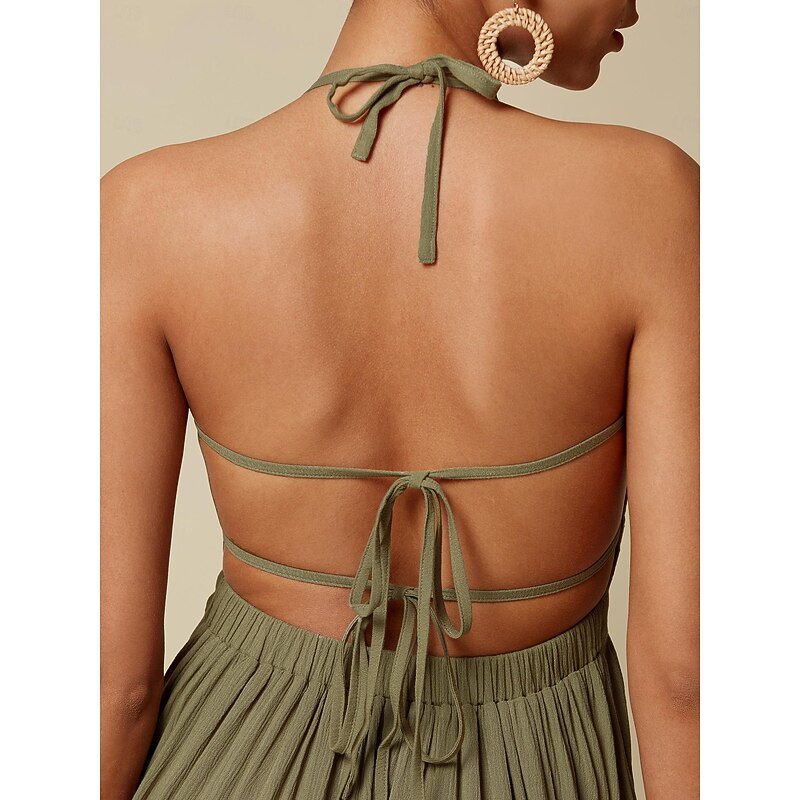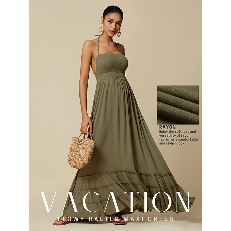 Women's Resort Maxi Dress Smocked Waist Blue Elegant Halter Neck Cami Maxi Dress Beach Cover Up 17