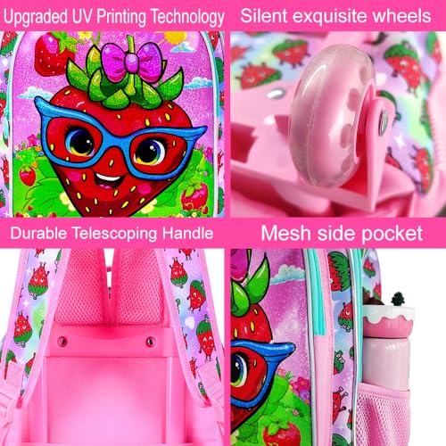 KLFVB Girls Rolling Backpack, 3PCS Kids Roller Bookbag with Lunch Bag, Wheeled School Bag for Children - Strawberry 4
