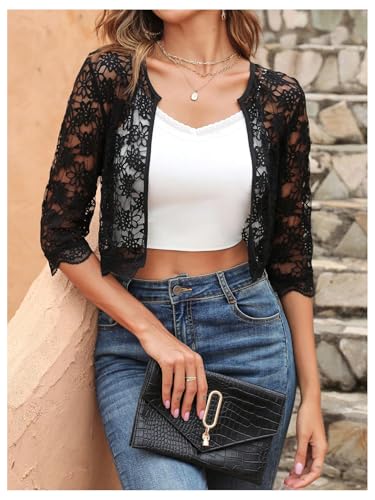 SHENHE Women's Sheer Lace Open Front 3/4 Sleeve Lightweight Cropped Jacket Shrug Bolero