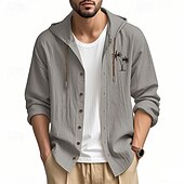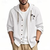 HOT ! Men's Shirt Linen Shirt Casual Shirt Button Up Shirt Cotton Shirt Coconut Tree Vacation Hawaiian Black White Sky Blue Khaki Long Sleeve Hooded Spring Fall Clothing Apparel Print