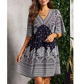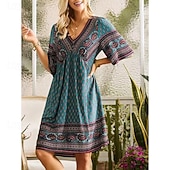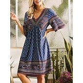 Highlights [Fabric] Crafted from high-quality polyester, this summer dress offers a lightweight and breathable feel. The fabric ensures comfort during warm days, providing a soft and pleasant touch against the skin. [Style] The dress features a relaxed, regular-fit design, perfect for casual streetwear style. Its flowing A-line silhouette and knee-length cut offer an effortless and chic look, allowing for ease of movement. [Design Highlights] This charming dress showcases a flattering V-neckline and short sleeves, enhancing its breezy appeal. The dress is adorned with intricate graphic prints, including floral patterns and geometric accents, adding a touch of whimsy and sophistication to its overall design. [Occasions] Ideal for vacations, holidays, and casual street outings, this dress is versatile enough to suit a variety of summer events. Whether you're exploring new destinations or enjoying leisurely weekends, this dress keeps you looking stylish and comfortable. [Size Range] Available in a wide range of sizes, from S to 5XL, this dress accommodates various body types. This ensures every woman can enjoy its flattering fit and stylish design.