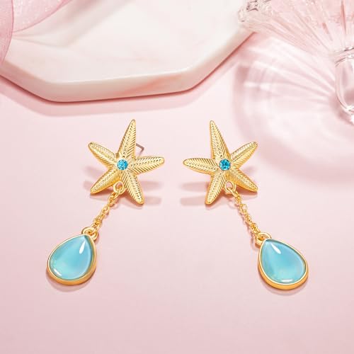 Starfish Dangle Earrings Gold with Blue Rhinestone Aqua Teardrop Chain for Women, Tropical Beach Vacation Jewelry Summer Gifts, E08B 5