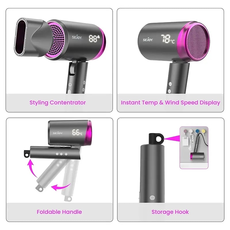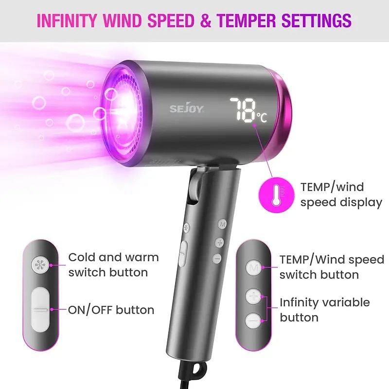 18800RPM Ionic Hair Dryer Adjustable Temperature & Wind Speed 20 Million Negative Ions LED Display 1800W Foldable Handle Compact For Travel 7