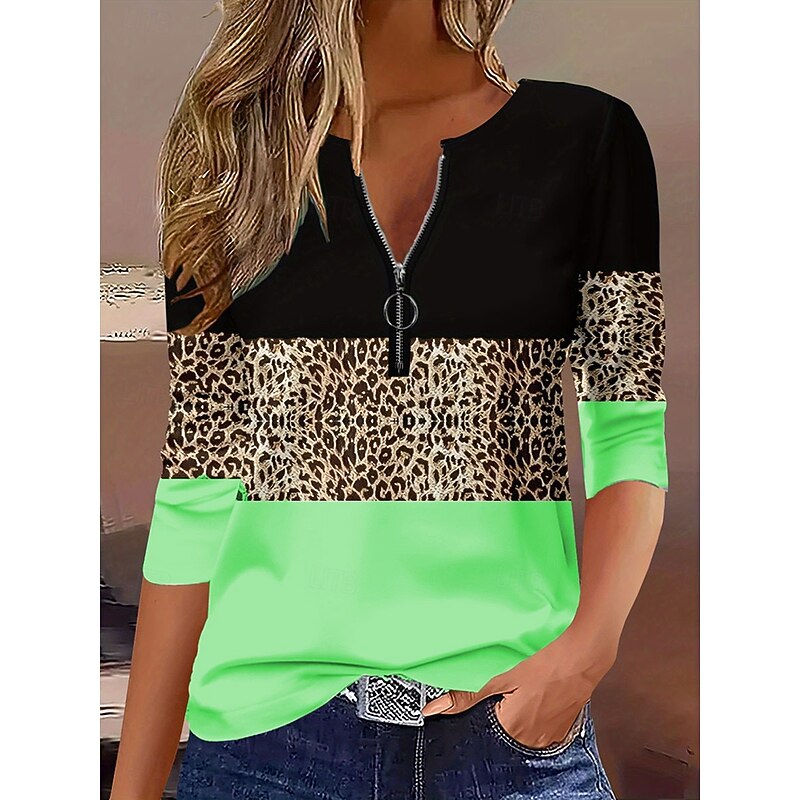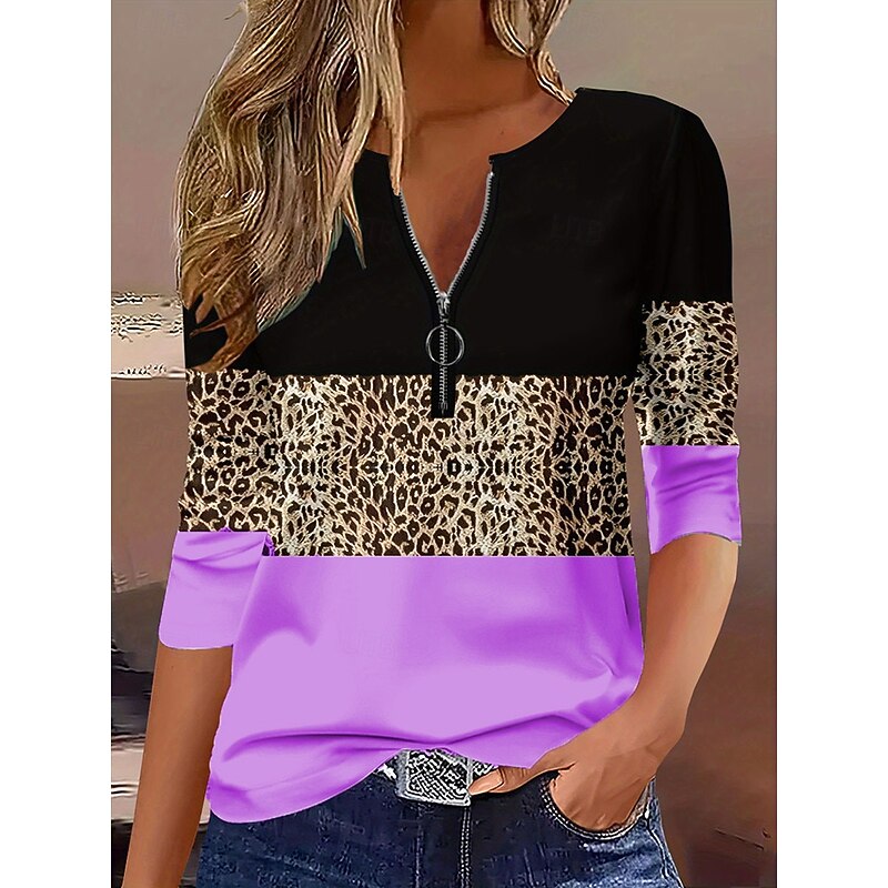 More information about Women's T Shirt Graphic Leopard Color Block Vintage Stylish Classic Long Sleeve Round Neck Regular Tops Daily Weekend Zipper Print White Pink Blue Purple Green Spring Fall Winter