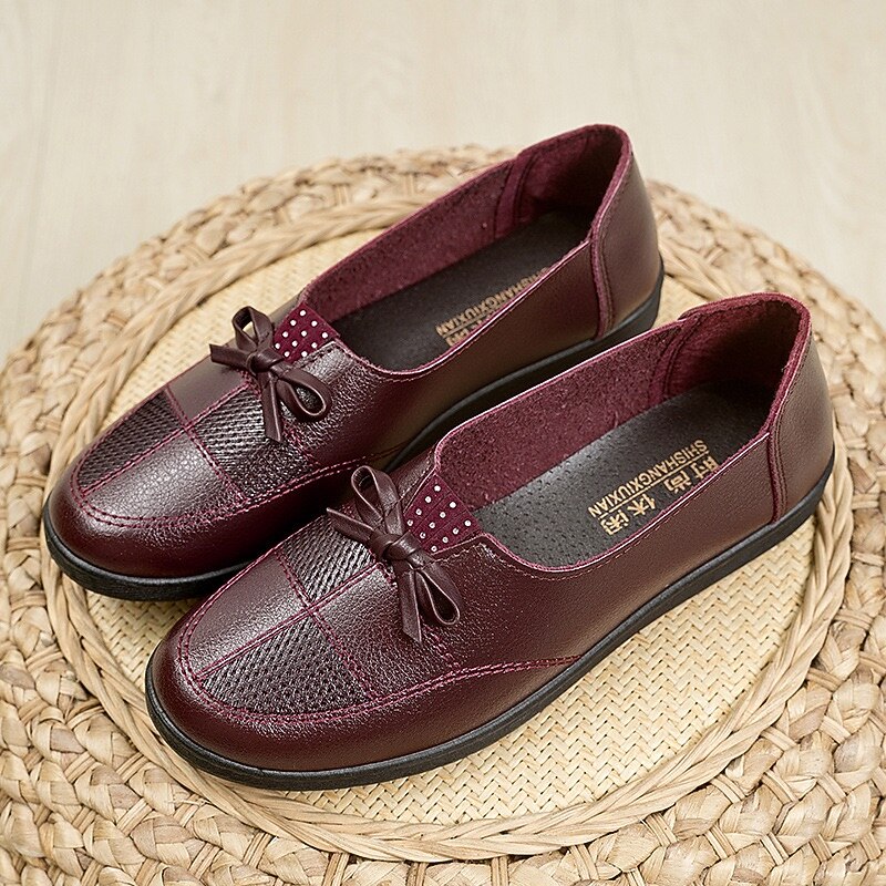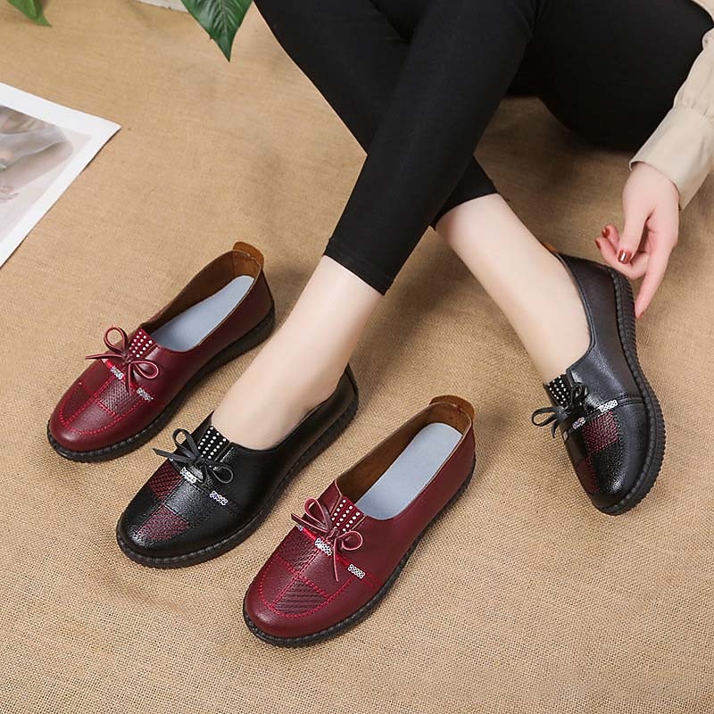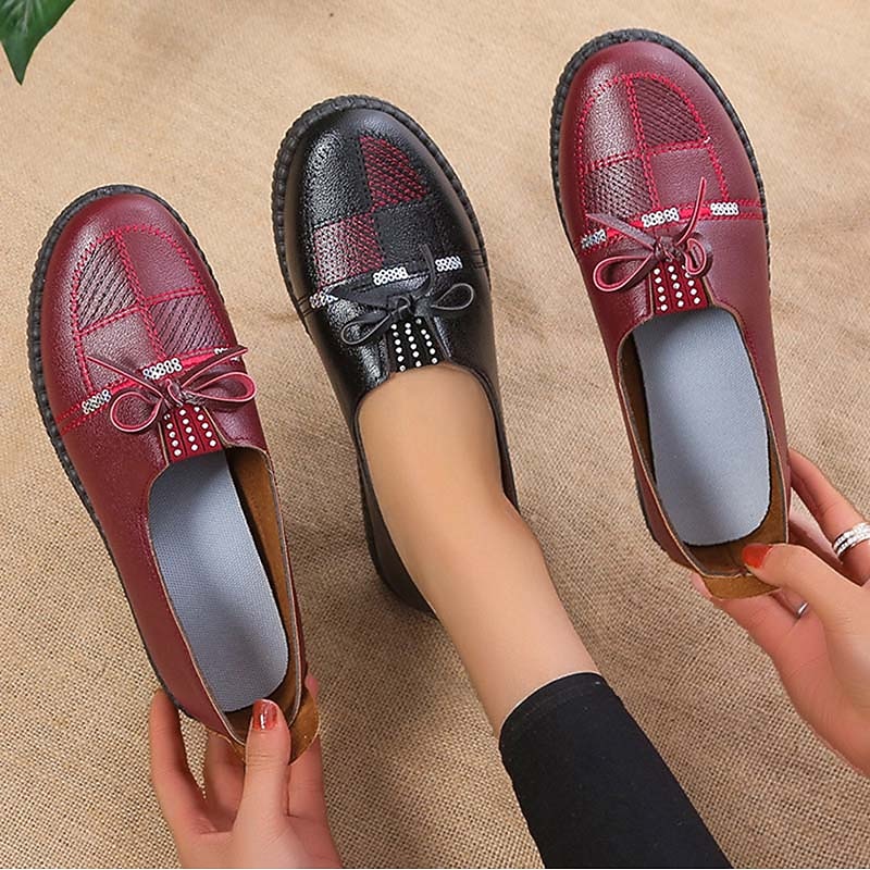 Highlights [Fabric & Construction] Expertly crafted from high-quality faux leather, these women’s flats offer both durability and a sophisticated look. The material provides flexibility, making them suitable for long hours of wear without compromising on style. [Design & Highlights] These shoes feature a unique color-block design that combines striking black and deep red hues for a contemporary and chic appearance. Key design elements include a decorative bowknot for added elegance and a round toe shape for a classic touch. The flat heel adds to the comfort without sacrificing style, making these shoes a versatile choice for various outfits. [Occasions] Perfect for daily wear, these flats excel in both casual and business settings. Whether you're heading to the office or enjoying a leisurely weekend, these shoes add comfort and modern flair to any ensemble. [Size Range] Available in a comprehensive range of sizes including US5.5 to US8.5, ensuring a comfortable fit for a wide variety of foot sizes. [Comfort Features] Designed with a supportive outsole made from PVC, these shoes offer grip and stability with each step. The cushioned insole enhances comfort, making them ideal for all-day wear and ensuring every step is taken with ease.