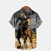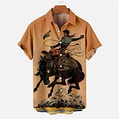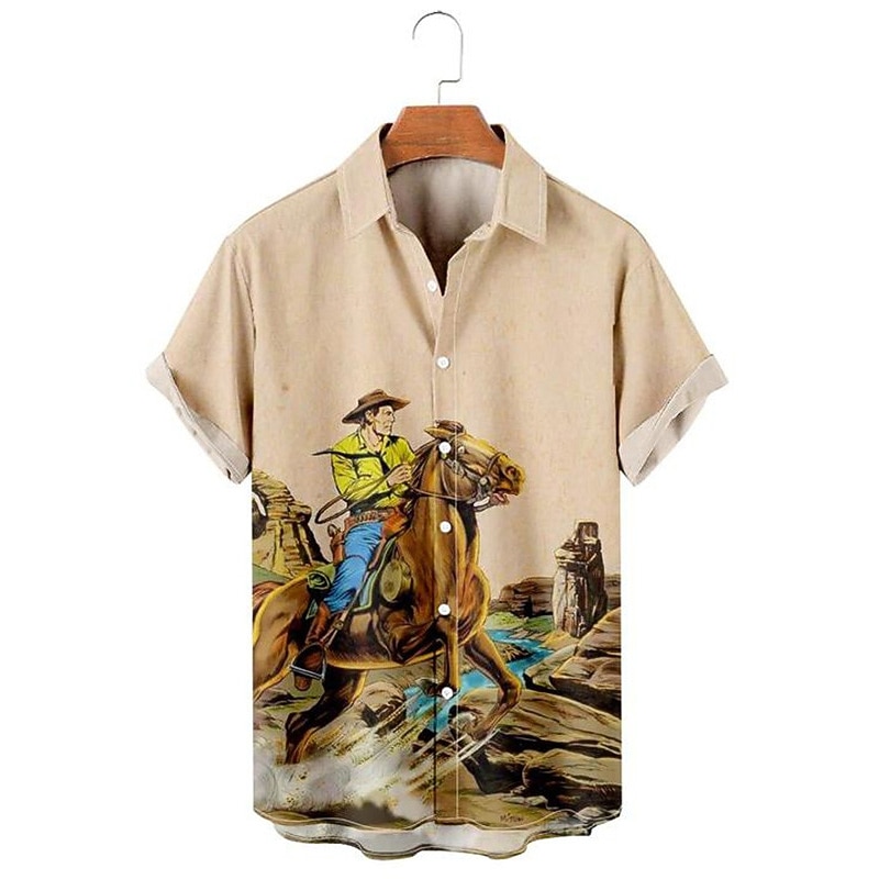 Highlights [Fabric] This men's vintage cowboy shirt is crafted from a lightweight and breathable polyester fabric, making it perfect for hot summer days. The material ensures comfort while maintaining durability, ideal for outdoor and beach activities. [Fit] Designed in a relaxed, regular fit, this shirt offers both comfort and flexibility. It's suitable for those who appreciate a mix of retro and modern fashion with ease of movement. [Design Highlights] Featuring a striking cowboy-themed print, this shirt stands out with its bold, eye-catching graphics. The classic turndown collar and button-down front add a touch of timeless style, while a practical front pocket enhances functionality. [Occasions] Perfect for outdoor adventures, beach getaways, or casual outings. This vintage Hawaiian shirt embodies a laid-back, tropical vibe, making it an ideal choice for various spring and summer occasions. [Size Range] Available in a wide range of sizes, from S to 3XL, catering to different body types. Enjoy the flexibility of finding the perfect fit for any wardrobe need.