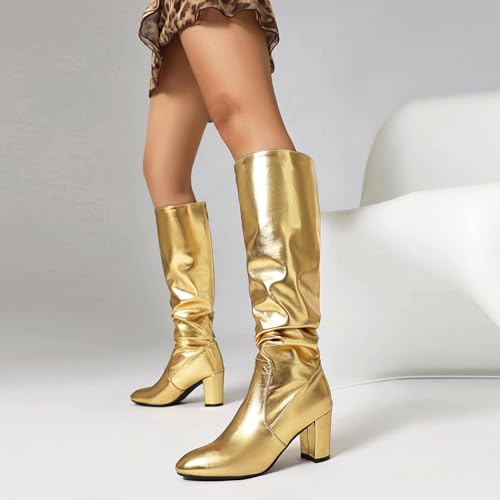 BEAUPAS Women's Knee High Boots Metallic Slouch Boots Chunky High Heel Tall Boots Round Toe Dress Shoes 7