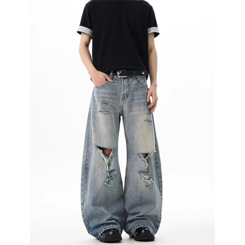 HOT ! Men's Vintage Y2k 2000S Blue Ripped Jeans High Wide Leg Denim Pants Streetwear Baggy Cargo Trousers