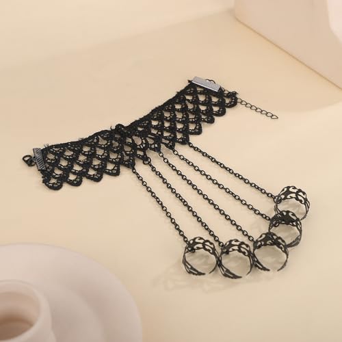 Denifery Dainty Vintage Gothic Halloween Black Lace Bracelet with Ring Bangle Metal Crystal Charm Steampunk Lace Black Slave Hand Chain Tassel Bracelet Rings for Women 1