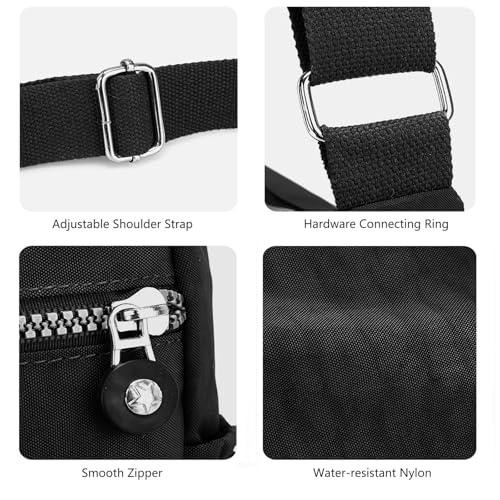 Fabric type: Nylon,PolyesterOrigin: ImportedClosure type: ZipperLining: Polyester【Must-read information】:PRIOR TO PURCHASING, CAREFULLY REVIEW THE SIZE AND COMPARE VISUALS IN PICTURES to ensure the correct size is chosen. Dimension: 9.8 L x 3.9H x 8.2 W(25x10x21CM), weight: 0.57lb(0.26KG), lightweight nylon purses for women, large space enough to carry your daily staffs. And the shoulder strap, with sufficient length, can be adjusted freely according to your needs.【Water-resistant and Lightweight】 Made of Water-resistant, stain resistant, washable, lightweight, sturdy and soft-touch nylon fabric, detailed with polyester lining. Also the casual nylon crossbody purse equipped with smooth zippers & great metal hardware, easy quick access and strong enough to maintain a long time using. sophisticated and casual design, great to classy dressed up.【Multifunction Shoulder Bag】 Come with an adjustable and detachable shoulder strap, wide and comfortable, easy to convert and adjust. A variety of wearing as over shoulder bag, messenger bag, handbag or clutch phone wallet, mobile phone bag, cross body bag. Great for travel as well as everyday use.【Roomy Zippered Compartments】2 side pockets, 3 front zipper pockets, 1 rear zipper pocket on the outside of the bag, Inside with 1 main compartment, 1 zipper pockets and 2 open pockets for phone/cards. The multi pocket purses for women is easy to organize your contents, such as phone, small wallet, sunglasses, sanitizing wipes, keys, credit cards, chapsticks, coins, headphones, license and etc. Keep all stuffs needed in, without being a huge and heavy tote bag.【Daily Use & Awesome Gift】 Simple and elegant to use, small but practical design. The waterproof purses great for daily work, travel, shopping, dog walking, hiking, going out for a walk, jogging and fitness. Also the cute bag is perfect as Gift for Her Birthday, Valentine's Day, Mother's Day, New Year, Thanksgiving Day, Halloween and Christmas gifts. Perfect for everyday use. excellent materials and excellent craftsmanship ensure long-lasting durability.