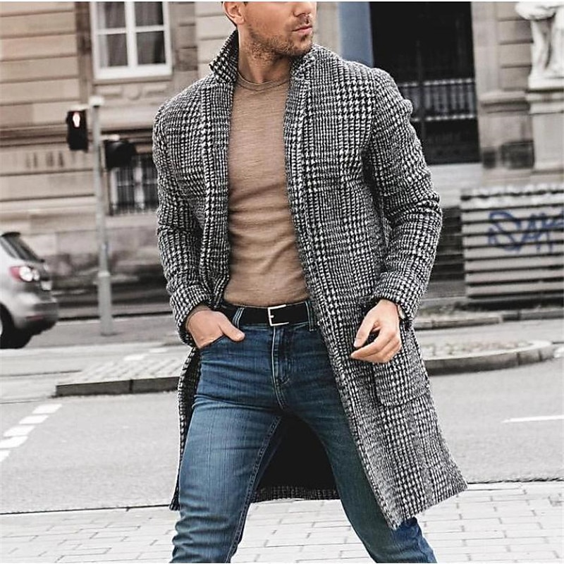 Men's Winter Coat Overcoat Business Casual Fall Winter Polyester Outerwear Clothing Apparel Houndstooth Notch lapel collar Open Front