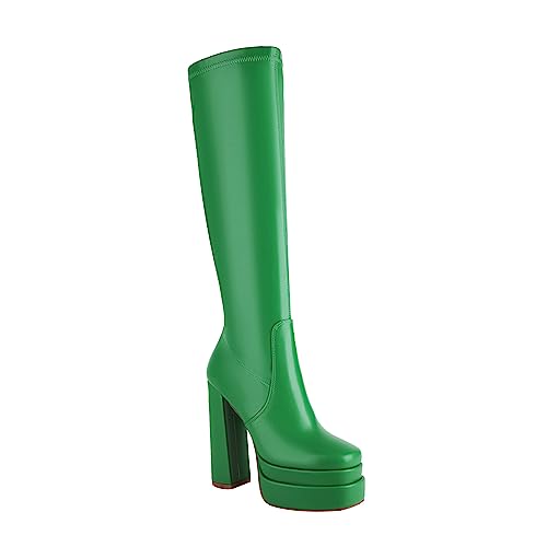 vivianly Women's Platform Knee High Boots Square Toe Chunky Heel Long Stretch Gogo Boots with Side Zipper 5