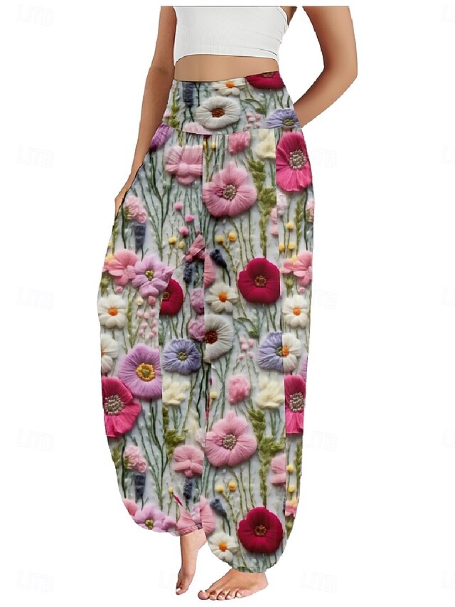 Women's Linen-Inspired Pants Wide Leg Pants Trousers Ethnic Style Casual Boho Full Length High Waist Floral Pocket Elastic Waist Printing Breathability Soft Micro-elastic Outdoor Yoga Pink Purple 10