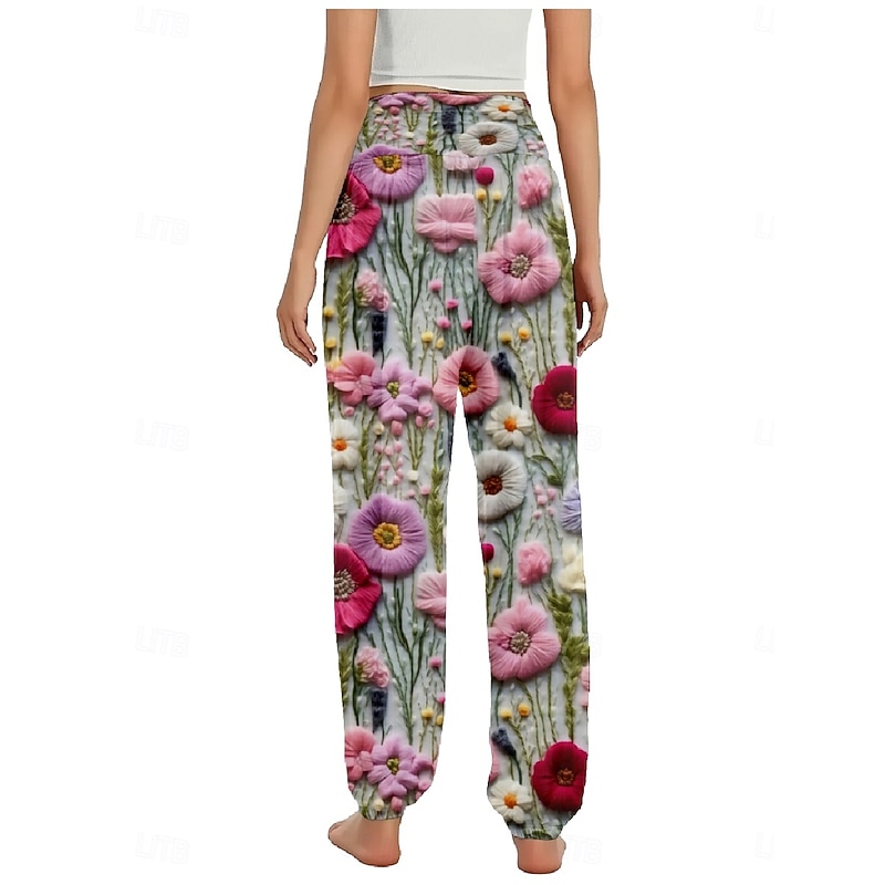 Women's Linen-Inspired Pants Wide Leg Pants Trousers Ethnic Style Casual Boho Full Length High Waist Floral Pocket Elastic Waist Printing Breathability Soft Micro-elastic Outdoor Yoga Pink Purple 15