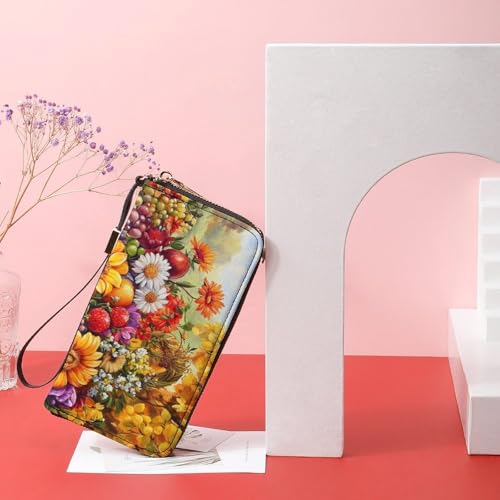 Flowers Fruits Basket Harvest PU Leather Clutch Long Bifold Wallet, Coin Purse Credit Pass Case, Durable Card-Holder Money Storage for Women Men 6