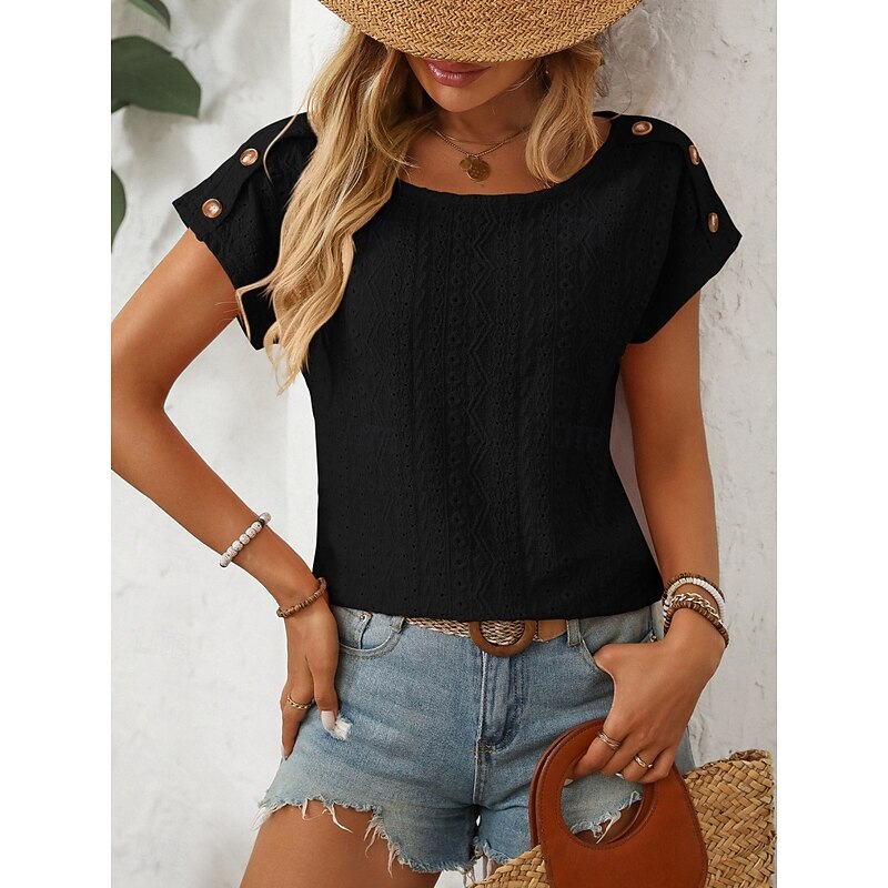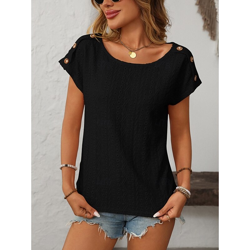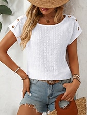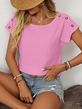 More information about Women's T Shirt Solid Color Plain Fashion Modern Casual Short Sleeve Crew Neck Regular Tops Daily Weekend Buttons Black White Pink Beige Summer
