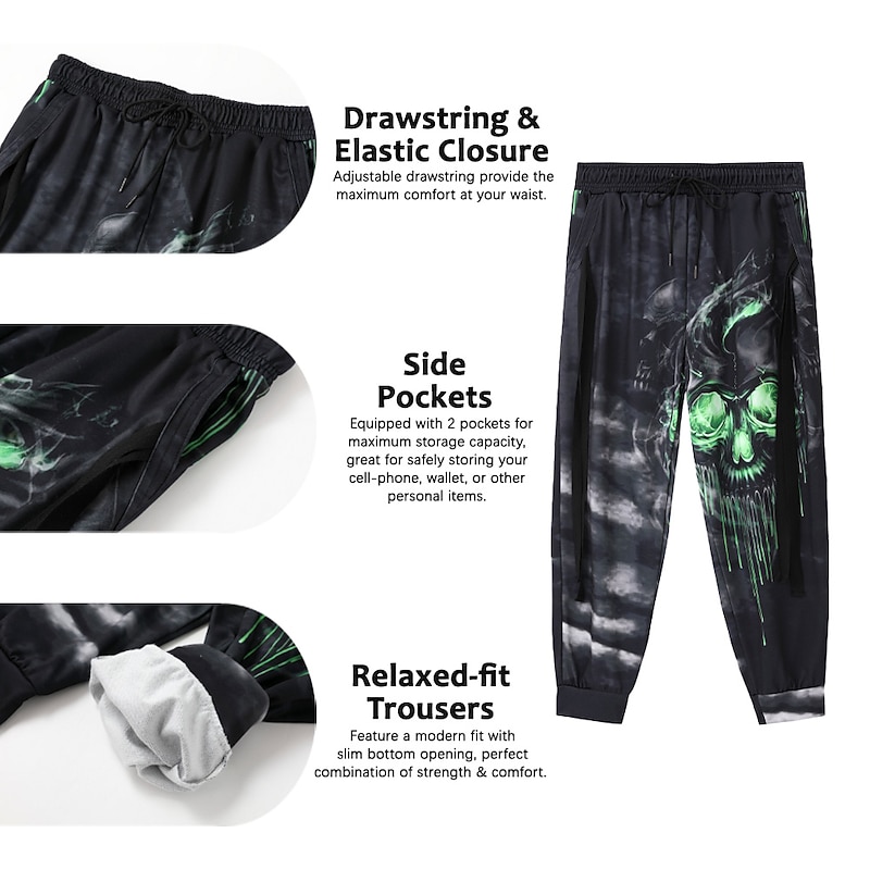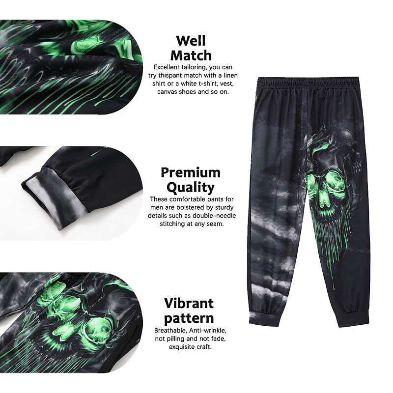 Highlights [Fabric and Comfort]: Crafted from a soft cotton blend and terry fabric, these men's jogger sweatpants offer micro-elasticity for both comfort and durability. The breathable material ensures ease of movement, making them suitable for active wear and everyday comfort. [Fit and Design]: Featuring a regular fit, these jogger trousers come with a mid-waist and an adjustable drawstring elastic waistband, providing a custom and comfortable fit. The cuffed ankles add to their snug and stylish appearance, perfectly complementing the modern streetwear vibe. [Unique Design Highlights]: These sweatpants boast a striking graphic print design, adding a bold and fashionable edge to your outfit. The incorporation of a ribbon detail adds a distinctive touch, enhancing the overall design. [Occasions]: Ideal for a variety of occasions, including sports, outdoor activities, casual daily wear, and streetwear styles. These joggers are perfect for spring and fall, offering versatility and style for various events and settings. [Size Range]: Available in sizes S, M, L, XL, XXL, and 3XL, these sweatpants provide options to fit a wide range of body types, ensuring a comfortable and fashionable choice for all.