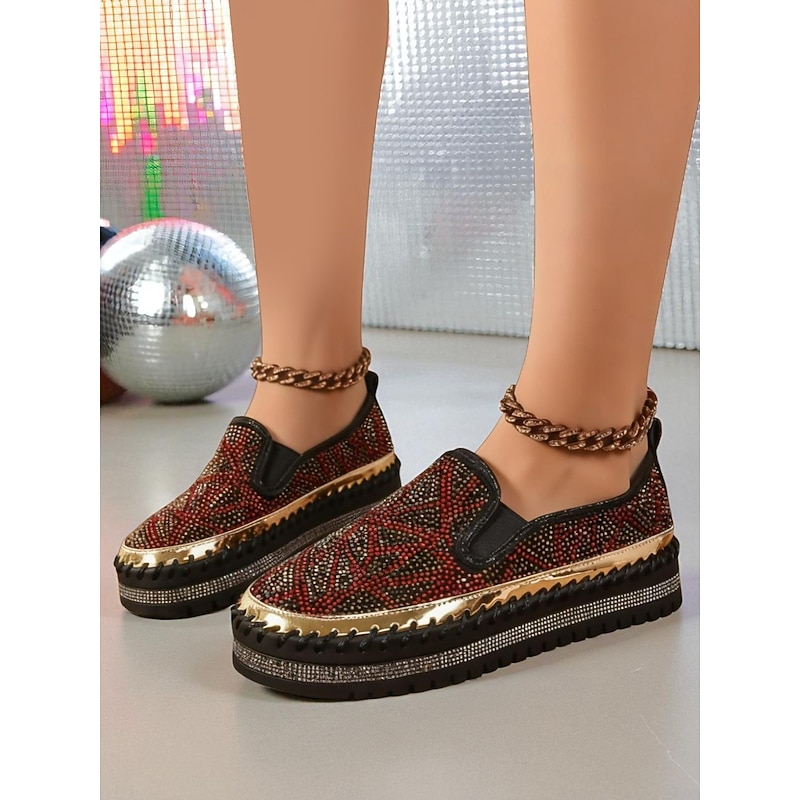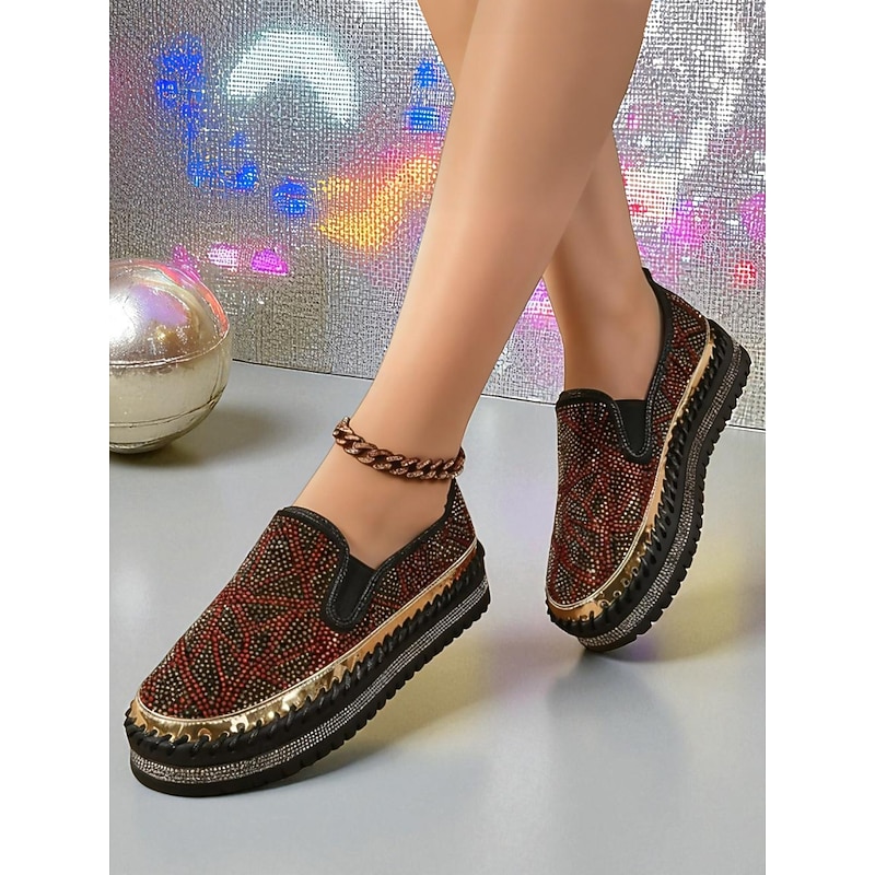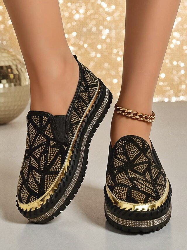 HOT ! Women's Black Gold Rhinestone Slip-On Platform Loafers, Sparkly Chunky Sole Party Shoes for Nightlife & Club Outfits