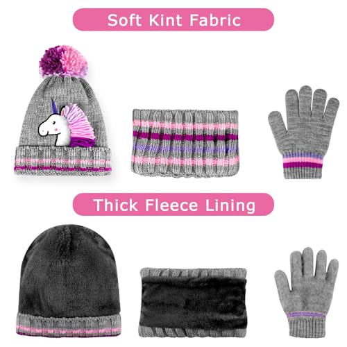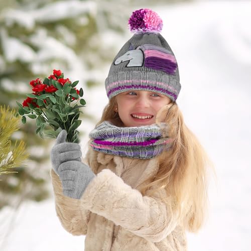 • Toddler Hat and Glove Set - 3Pcs kids winter hats and gloves sets for unicorn in total, 1pcs knit hat with colorful pom poms, 1pcs winter scarf neck warmer, 1pair fingers Winter gloves. Toddler girl hat and gloves set, you can wear it for your children alone or in combination. Girls winter hat is unicorn patterns, and very fashionable, girls beanie with a pompon will make your children look cuter in cold winter weather. Hat and gloves for girls offer your lovely kids considerate care!