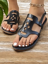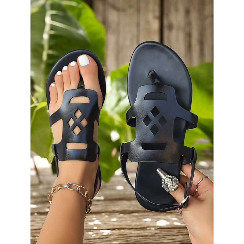HOT ! "Women's Brown Cut-Out Faux Leather Flat Sandals with Adjustable Strap - Casual Summer Shoes for Everyday Wear and Vacations
