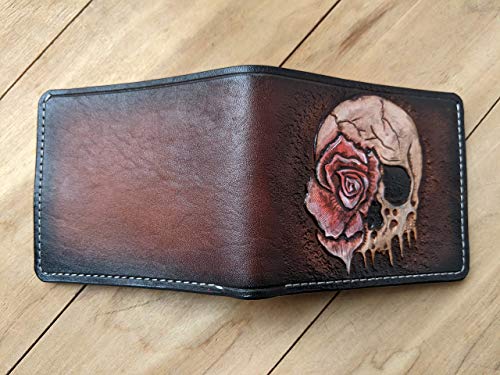 Men's 3D Genuine Leather Wallet, Hand-Carved, Hand-Painted, Leather Carving, Custom wallet, Personalized wallet, Skull, Skeleton, Rose 1