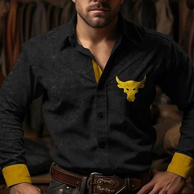 HOT ! Men's Bull Color-blocking Shirt Western Shirt Cowboy Shirt Long Sleeve Vintage Retro Outdoor Vacation Spring Fall Turndown 3D Print Linen Like Shirt Black Khaki