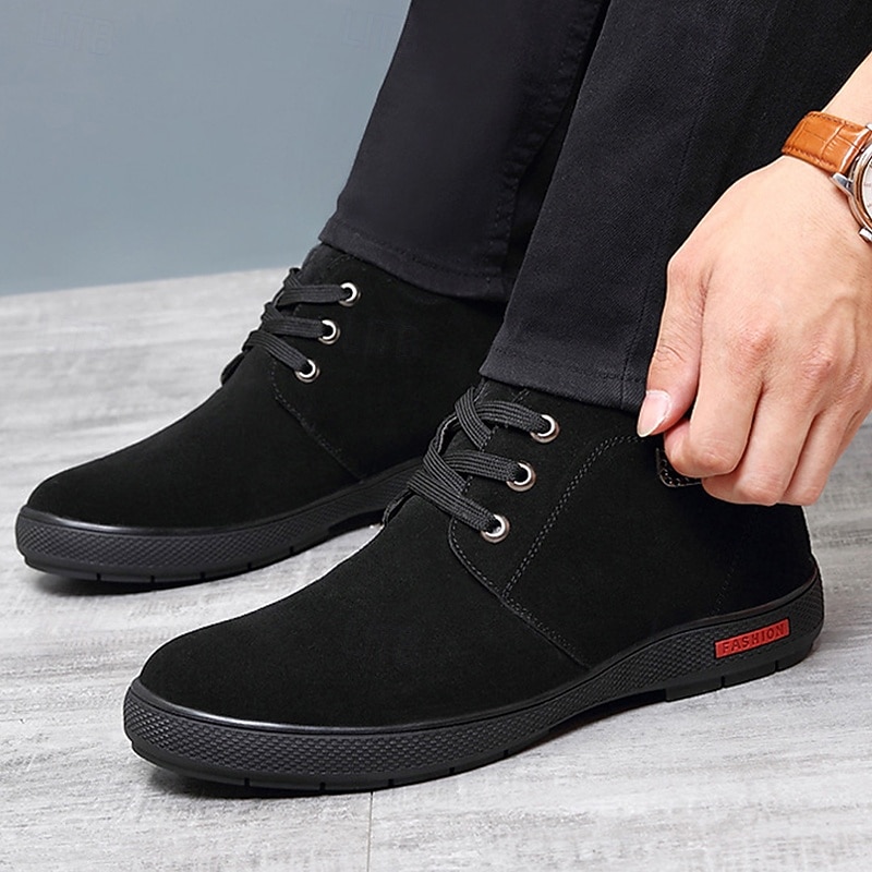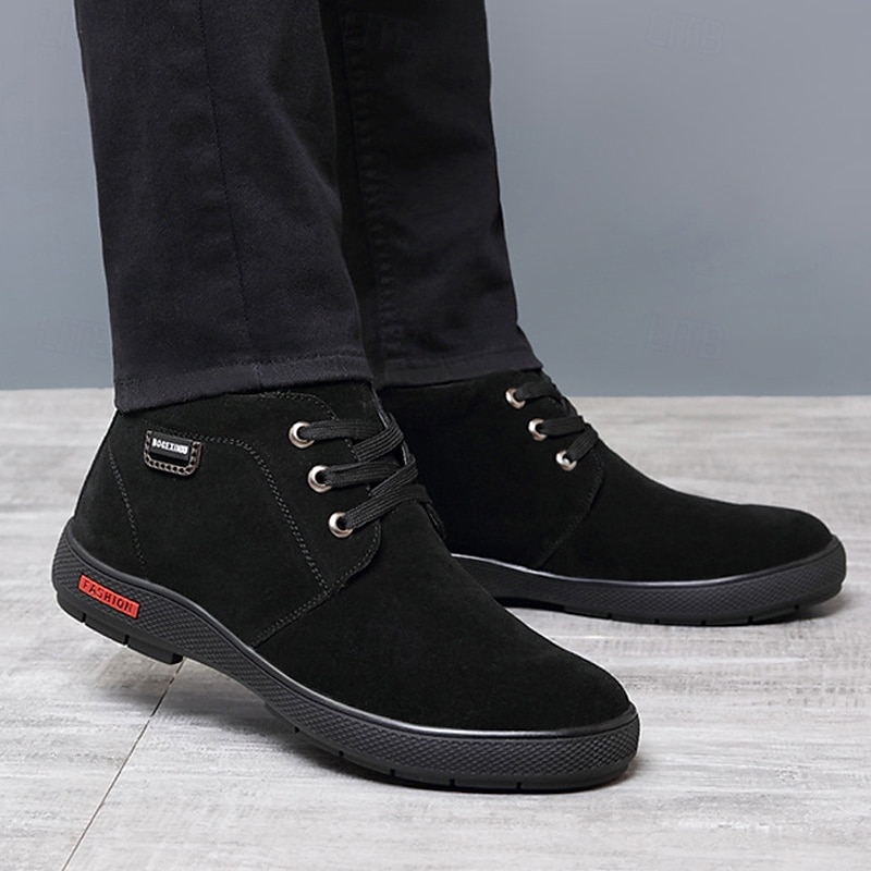 Highlights [Fabric and Fit] : Designed with high-quality faux suede, these men's ankle boots offer a sleek and sophisticated look. The plush lining ensures both warmth and comfort, making them an ideal choice for colder weather. The classic round toe design and lace-up closure with durable metallic eyelets provide a snug fit for various foot types. [Design Highlights] : These boots feature a deep brown color, enhanced by subtle red branding accents on the robust rubber sole for excellent traction and durability. The timeless design is complemented by modern elements, making these boots both stylish and practical. [Occasions] : Perfect for winter outings, casual gatherings, and semi-formal occasions, these boots seamlessly blend charm and functionality. Whether you're dressing up for a business-casual event or enjoying a casual weekend day, they are a versatile addition to any wardrobe. [Size Range] : Available in sizes US7 to US11.5, catering to a wide range of foot sizes. Whether you have smaller or larger feet, these boots are designed to provide a comfortable fit for everyone.