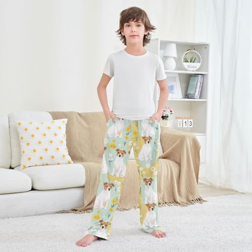 Jack Russell Dog Daisy Flowers Boys Long Pants Soft Trousers Elastic Waist Kids Lounge Bottoms with Pockets S-XL 1
