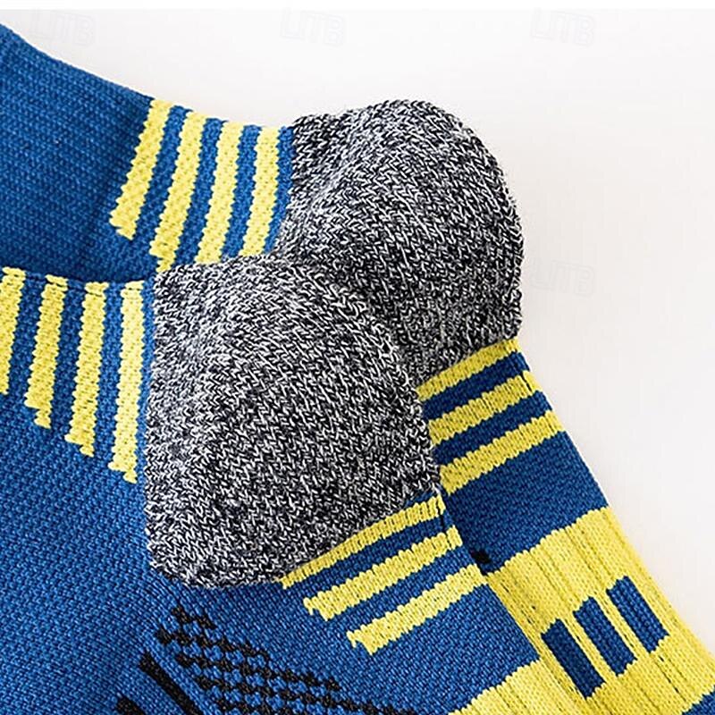 : The set includes three stylish pairs: a blue pair with yellow accents, a white pair with black details, and a black pair with white highlights, each featuring reinforced gray heels and toes for enhanced durability.
