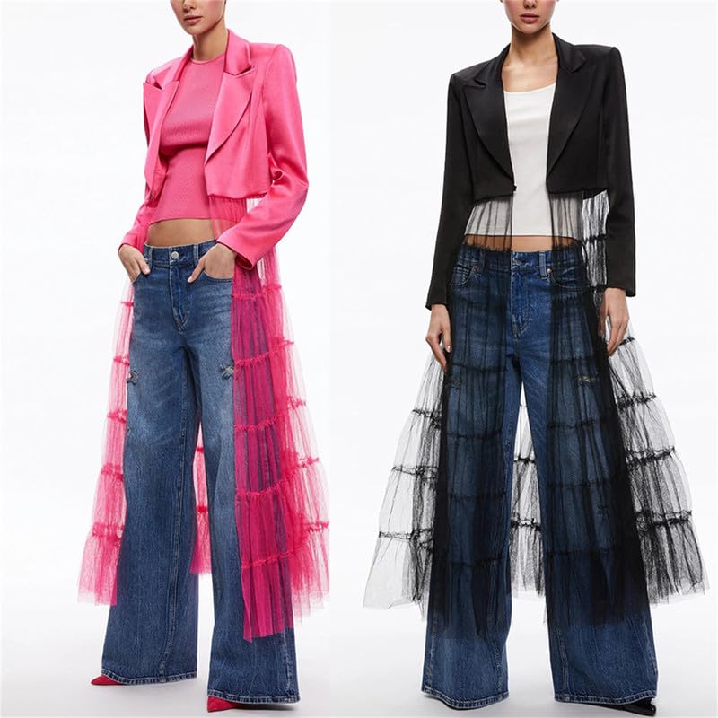 • 🌸🌷Design:Satin Patchwork Mesh Blazer Dress,Flowy Sheer Swing,Mesh Cropped Blazer,Prom Jacket Dress,Elegant Tulle Blazer Jacket