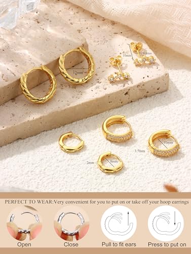 JeryWe Hypoallergenic Gold Hoop Earrings for Women S925 Sterling Silver Post Chunky Cartilage Earring Stacks Non Tarnish 14K Gold Filled Small Hoops Stud Set Jewelry 6