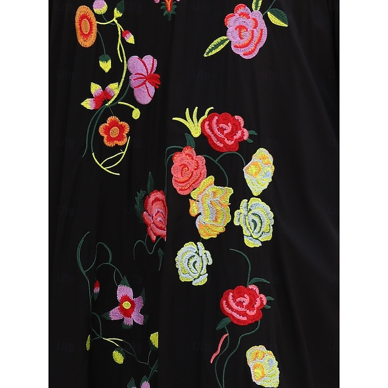 Highlights [Fabric and Material] : Crafted from soft, breathable viscose fabric, this dress offers comfort and ease, while the included rayon ensures a luxurious feel that is perfect for fall and winter seasons. The inelastic nature of the material maintains the dress's elegant silhouette. [Fit and Style] : Designed with a regular fit, this A-line dress features a charming bishop sleeve and a refined V-neck, offering a combination of both boho and elegant styles. The long sleeves and midi length make it suitable for transitioning from casual to semi-formal events with ease. [Design Highlights] : The captivating floral embroidery adds an artistic touch to the dress, enhancing its lively appeal. The embroidered details stand out against the classic black background, making it an ideal piece for those who appreciate intricate designs and vibrant patterns. [Occasions] : Whether you're attending a prom, date, formal event, vacation, or holiday gathering, this dress fits a variety of occasions. Its versatile nature makes it perfect for Valentine's Day celebrations, work, or even as a thoughtful gift. [Size Information] : Available in a range of sizes from S to 3XL, this dress accommodates a broad spectrum of body types, ensuring a comfortable and flattering fit for many. Follow care instructions to maintain the quality of the fabric and embroidery.