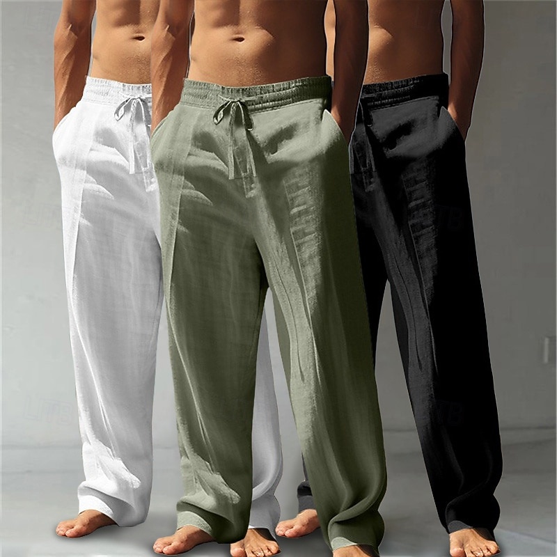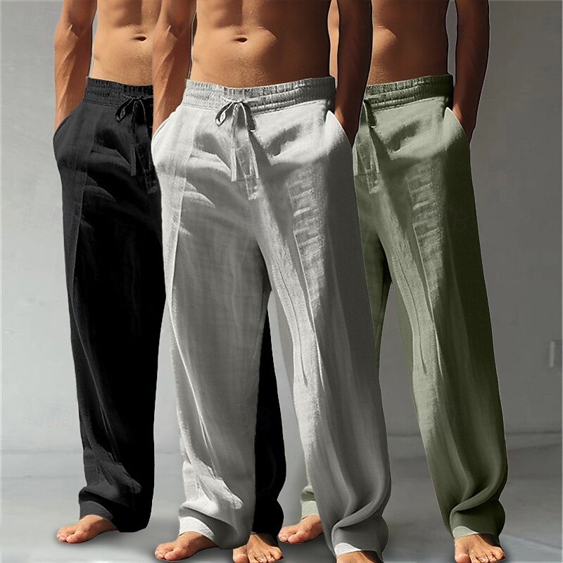 Men's Linen Pants Trousers Summer Pants Baggy Pants Beach Pants Drawstring Elastic Waist Straight Leg Plain Comfort Breathable Knee Length Outdoor Casual Daily Vacation Classic Style White+Black+Gray 3