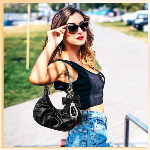 HOT ! Abbylike Coquette Ruched Shoulder Bag for Women Cute Leather Clutch Cloud Purse with Bow Charm Crescent Handbag Tote Bag Girl