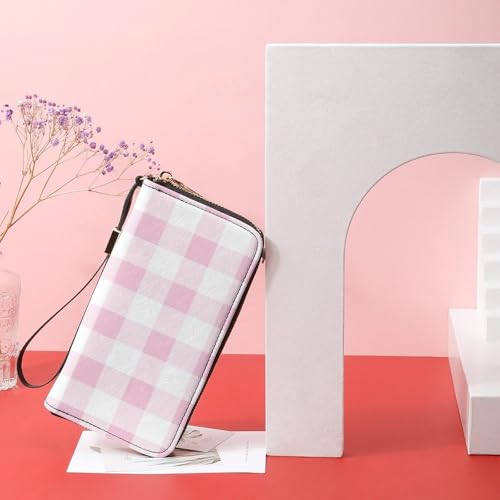 Light Pink White Checkered Texture PU Leather Clutch Long Bifold Wallet, Coin Purse Credit Pass Case, Durable Card-Holder Money Storage for Women Men 1