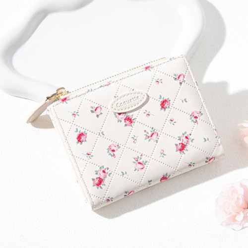 Sunwel Fashion Floral Prints Rose Wallet Small Bifold Wallet with Zipper Coin Purse Card Holder ID Window for Women Girls (CREAM) 1