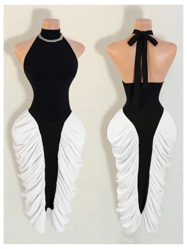• Features: This statement dress features dramatic ruched detailing, contrast patchwork panels, halter neckline with back tie closure, and body-skimming silhouette that elongates the figure