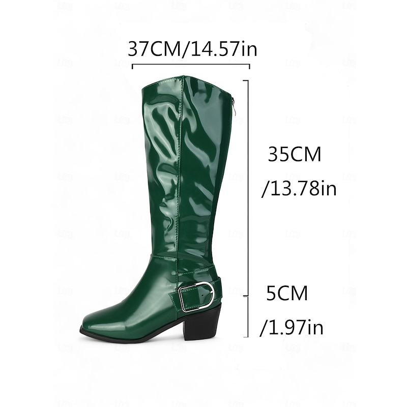 Women's Burgundy Patent Faux Leather Knee-High Boots – Mod Retro Style with Square Toe and Statement Buckle, Ideal for Autumn Outfits, Vintage-Themed Looks and Fashion Events 13