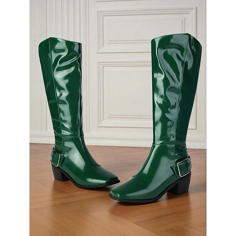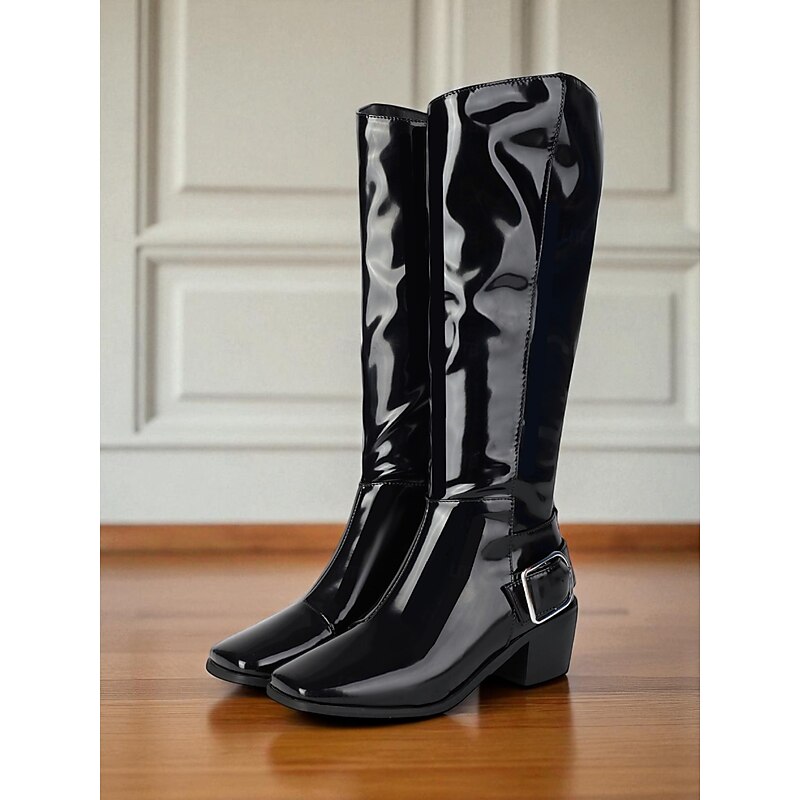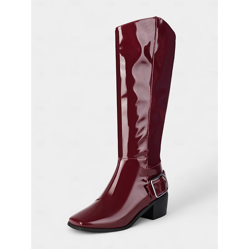 HOT ! Women's Burgundy Patent Faux Leather Knee-High Boots – Mod Retro Style with Square Toe and Statement Buckle, Ideal for Autumn Outfits, Vintage-Themed Looks and Fashion Events