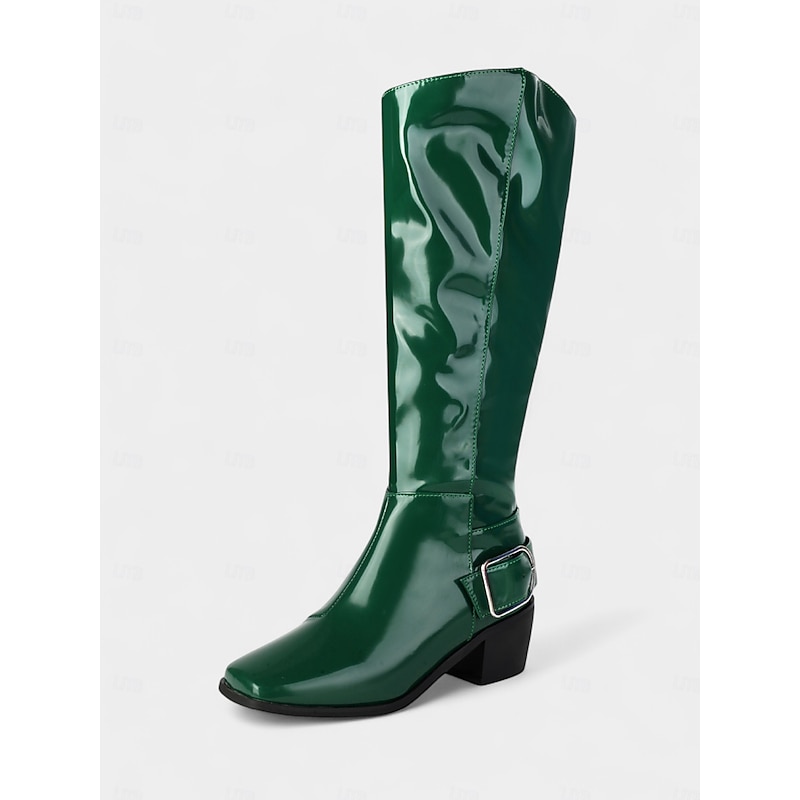Women's Burgundy Patent Faux Leather Knee-High Boots – Mod Retro Style with Square Toe and Statement Buckle, Ideal for Autumn Outfits, Vintage-Themed Looks and Fashion Events 12